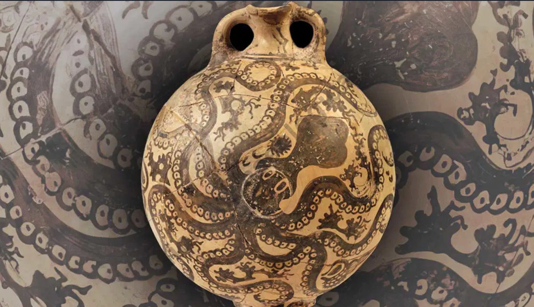 The pairing of these two images—the ancient Minoan octopus vessel and the stylized modern diagram—creates a visual dialogue that echoes the philosophical bridge your article builds. The Minoan vase, with its organic, fluid tentacles curling around a rounded surface, invokes the deep continuity of symbolic thinking. This is not a modern metaphor retrofitted for convenience—it is a symbol with ancient cognitive roots, recursive in its very presence. The octopus sprawls across the form, wrapping perception, ambiguity, and mystery into one gestural motif. It feels alive, like an intelligence shaped not by hierarchy, but by flow.